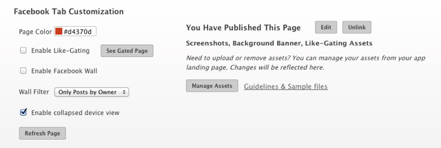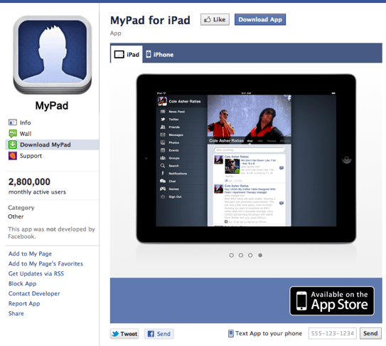 The Facebook application is pretty straightforward: developers can present a carousel of screenshots of their app, and there’s a field at the bottom of the page that lets users send a link to the app directly to their phone. There are a handful of other options (seen below), including the option to enable ‘Like-Gating’ (which means that users must ‘Like’ you on Facebook before they can view the details about the mobile app). Like Gating can be annoying for users, but it gives brands (and, in this cases, apps) a long-term communication channel with each user.