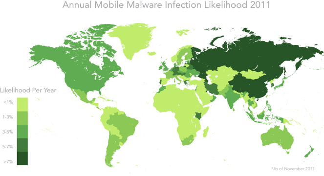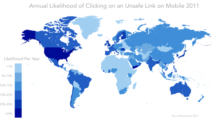 The report shows that the annual likelihood of an Android user encountering malware today has increased to 4 percent up from a 1 percent likelihood measured at the beginning of 2011. In fact, Android users worldwide have a 36 percent chance of clicking on an unsafe link in 2011 (up 6 percent from July 2011). In the United States, the likelihood of encountering an unsafe link is higher than the global average at 40 percent.