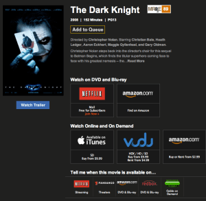 Traditionally, when reading an online movie review, for example, there’s been no easy way to create action based on that interest, so embedding a Watch It button in a movie review, on blogs or other related content sites, allows readers to click and view all the available options, across digital platforms — or to go buy tickets to see the movie in theaters. Of course, the likelihood is that you won’t be able to watch the whole movie right then and there, which is where the Watch It queue comes in, allowing you to watch a trailer, but save full viewing for later in “wish lists”. The site will then send you email notifications when a movie has transitioned from theaters to Netflix or On-demand, as the app is updated throughout the movie’s release cycle.