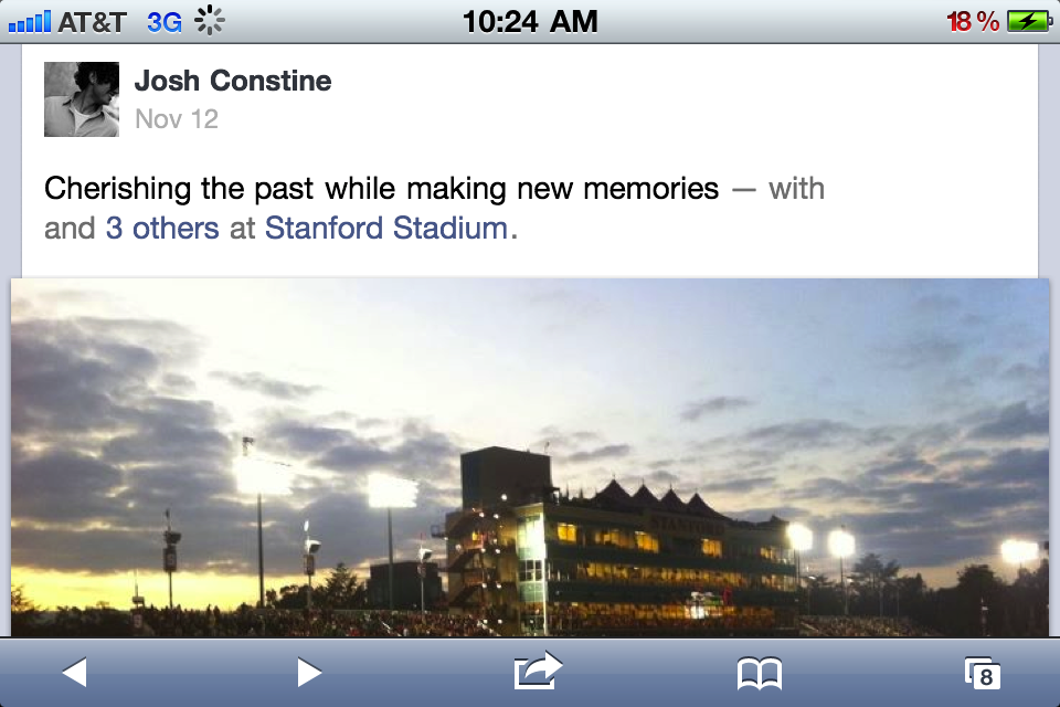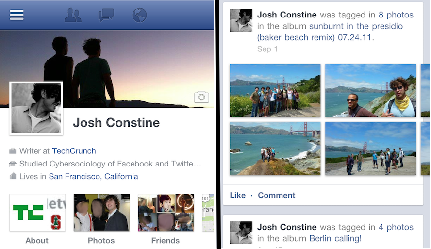 Facebook integrated some smart design into mobile Timeline. When showing photo albums, 4 thumbnails are displayed at a time, but you can swipe to view additional thumbnails. You can similarly swipe through Timeline Views to select to see someone’s Friends, Likes, Photos, or Subscribers. Overlaid controls let you edit your cover. Places posts on mobile Timeline do not link to the Google Maps website or app, and instead launches a Bing Maps mobile site.