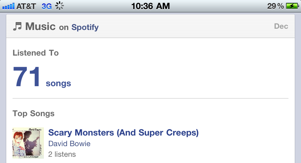 While there’s no word on the release of Timeline support for the Facebook for iPhone app, iOS and most other smart phone users can get to Timeline via m.facebook.com. [Update: Facebook released Facebook for iPhone 4.1 that supports Timeline access on December 18th.] If a Third-party Open Graph apps has a mobile version, in some cases it can be opened from Timeline. For example, mobile Timeline displays reports of your most listened to Spotify songs. If tapped, a Spotify mobile site loads which can then launch your native Spotify app where you can listen to that song.