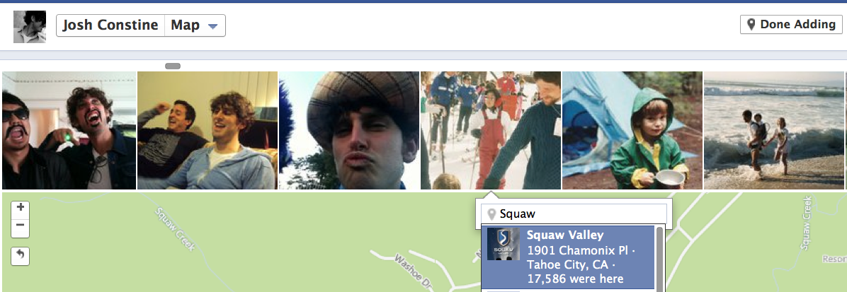 When Timeline became available for developers, Map only showed the Places you’d been tagged at, and didn’t let you directly add new data. Now, you can click “Where have you been?” to share travel memories, or “Add Photos” to bring up a “Where was this?” entry field over a thumbnail strip of photos you’re tagged in. The wizard slides you forward and asks you tag the next photo once you’d added location to the last one. You could probably add location to all your tagged photos quickly as each only takes a few seconds.