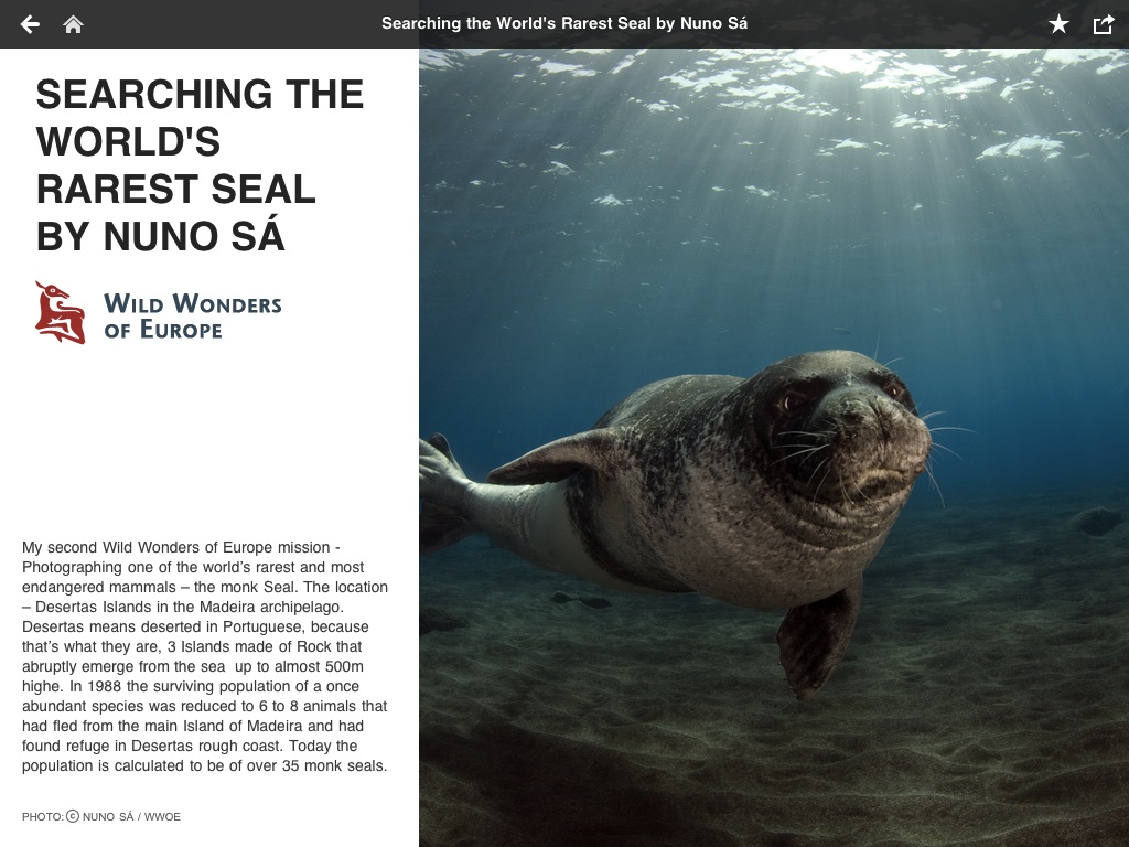 Instead of a relatively static set of highly-curated pictures around a single topic, you get a highly-curated set of pictures that changes every day. And each photo now has a narrative caption written by the photographer. Fotopedia started experimenting with this more magazine-like approach in September with its HTML5 website and integration into Flipboard. You can see what the “Wild Friends” magazine looks like on the web also.