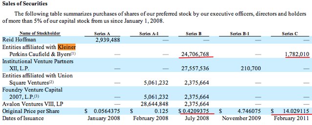 Investors such as Kleiner Perkins who participated in Zynga’s last private $485 million mega-round in February, 2011 will actually stil be underwater. According to a table in the S-1 filing, Kleiner bought 1.8 million shares at $14 in what was technically the Series C.