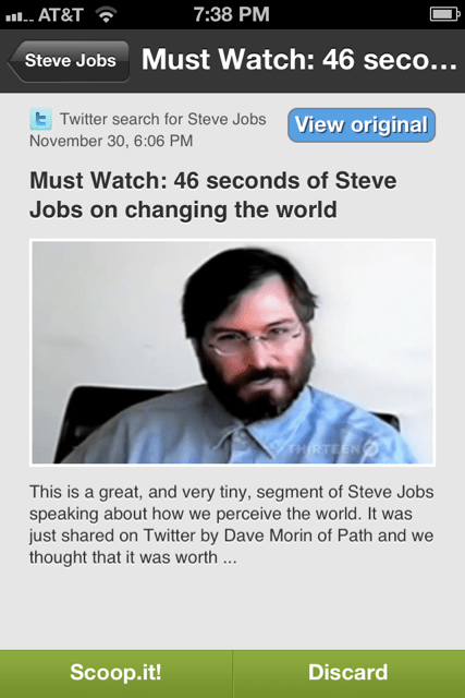 News curation startup Scoop.it has arrived on the iPhone today, allowing you to create your own digital magazine while on the go. The app, which works alongside the Scoop.it web service, essentially lets anyone be a publisher for any topic. Or perhaps, the more correct word is not “publisher,” it’s “aggregator.”