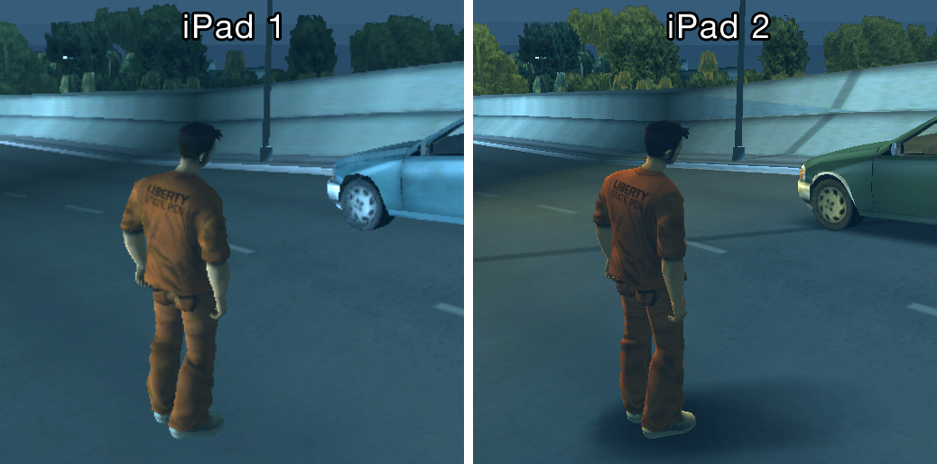 To say it “runs effortlessly” requires a bit of a caveat, though. Rockstar claims support for all of the more recent iOS devices, including the iPhone 4, iPad 1, iPhone 4S, and iPad 2. On the latter two, it’s butter. On the iPad 1, graphic quality takes a massive hit (see the comparison shot above) — and still, framerate issues tend to rear their head. (Alas, I don’t have an iPhone 4 handy to test it on, so I can’t comment on the compatibility there.)