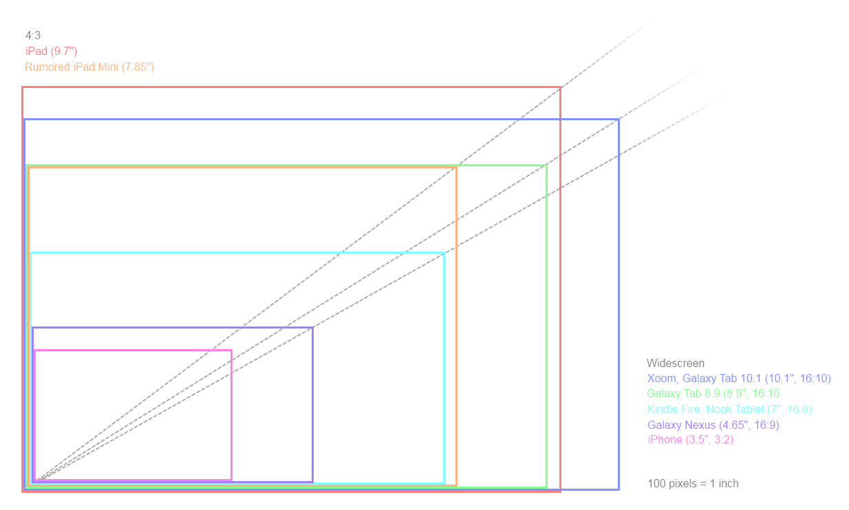 Supposedly this smaller iPad would retain the 1024×768 resolution, which is really the only option they had. The size is significantly smaller, but the fact that it’s 4:3 means that it’s also quite a bit larger than the Fire and other 7″ tablets. Here, I made you this chart, which may even be accurate: