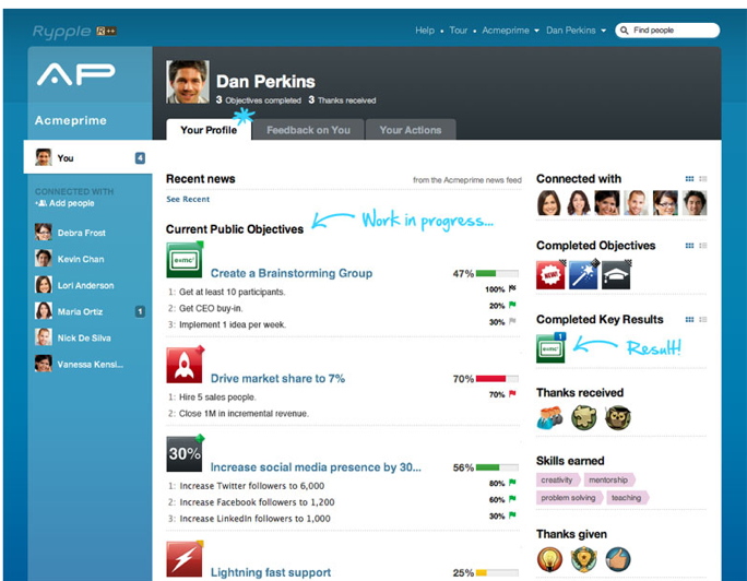 “Rypple amplifies behaviors that drive real performance,” Debow says. When it comes to coaching, goal setting, evaluations, and more, we are helping drive performance by actually replicating many of the social actions people take in their lives.” He uses an example of working with Spotify recently to help with goal setting. With a new ‘social goals 2.0,’ product, Rypple helped Spotify work with employees to evaluate how to use objectives and results to drive the business forward. Users could create objectives and goals for Spotify, invite people to comment, and commit to an objective, Debow explains.