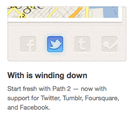 Dave Morin and Path’s secondary standalone app With “is winding down”, according to a tweet, email, and blog post from Path. “Now tweet who you’re with directly from Path”, the email explains. The encouraged migration signals the end of Path’s experiment with a stripped down, single feature experience.