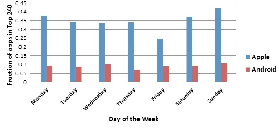 Meanwhile, Thursdays were the worst day to release apps on Android, as only 7% of apps reached the top 240 then. On iOS, Fridays were the worst, as only 10% of apps reached the top 240.
