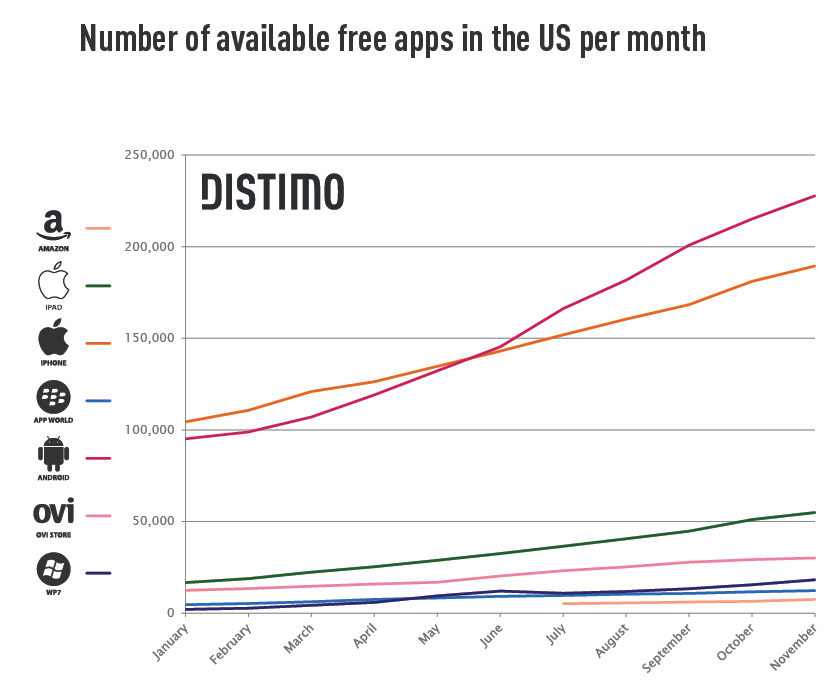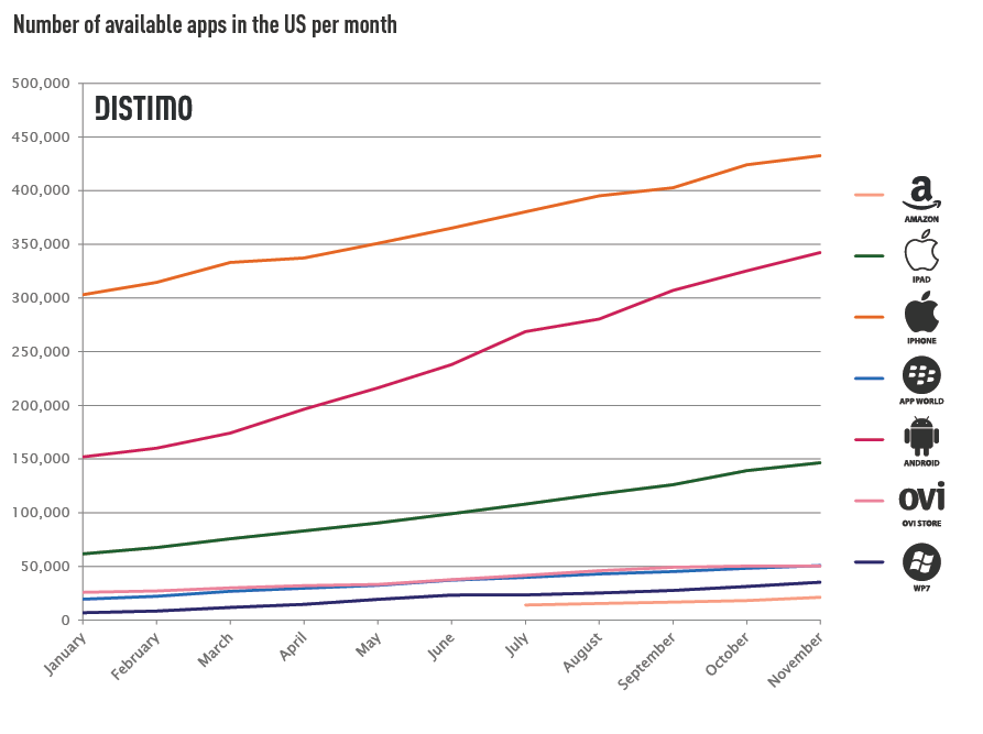 However, the general order of the stores ranked by size has remained constant during 2011: iPhone, Android, iPad are the top three. The only change involves BlackBerry App World, which is now just slightly larger than the Nokia Ovi Store in the U.S.