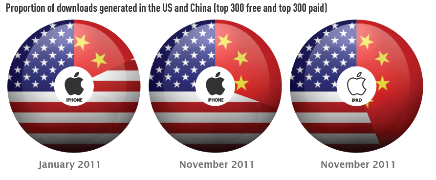 While all of the above figures pertain to the U.S. market, the company did note that the U.S. is no longer the single most important country for apps. In January, China generated only 18% of the downloads when comparing the U.S. iPhone App Store together with China’s. By November, it was generating 30% of the combined total downloads. And on the iPad, the two stores are almost equal in size in terms of downloads.