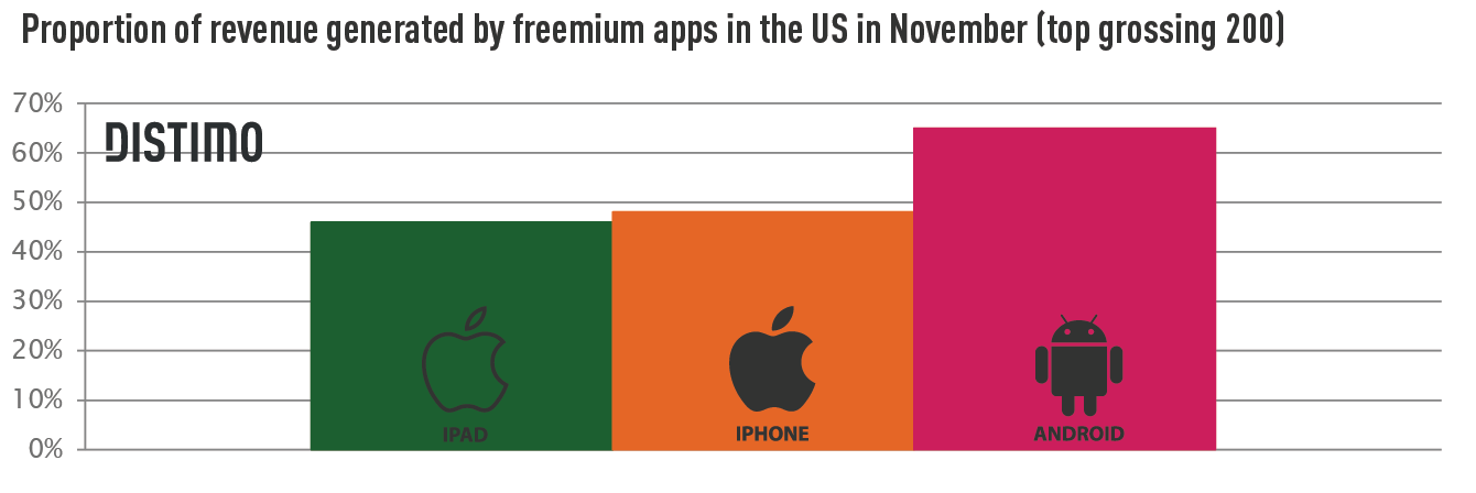 These figures are all that more impressive, considering the dramatic increases in apps using freemium business models as well as free apps supported by in-app purchases. Half of the revenue of the 200 top grossing apps are now freemium apps in the iPhone App Store, says Distimo. In the Android Market, that figure is even higher: 65% are freemium.