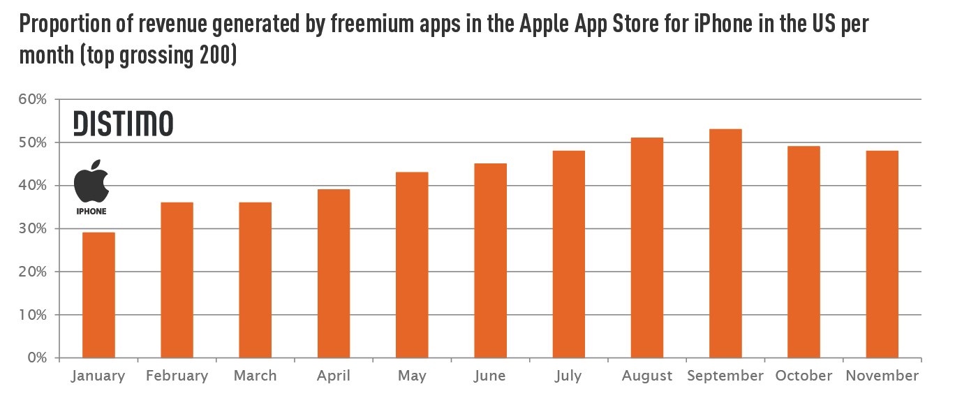 On the iPhone, the number of apps using the freemium model went from 29% in January to 53% in September, then fell slightly over the next two months.