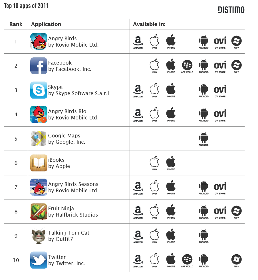 For one last bit of fun, the report concluded with the top apps of 2011. This is the real deal – not a subjective, editorially selected list, or a list divvied up by platform or paid status. Instead, Distimo matched apps across all platform and then matched the free and paid versions of the apps together. When looking at the combined free and paid download volumes this way, the winner of top app of 2011 was Angry Birds. (Yeah, shocker.)