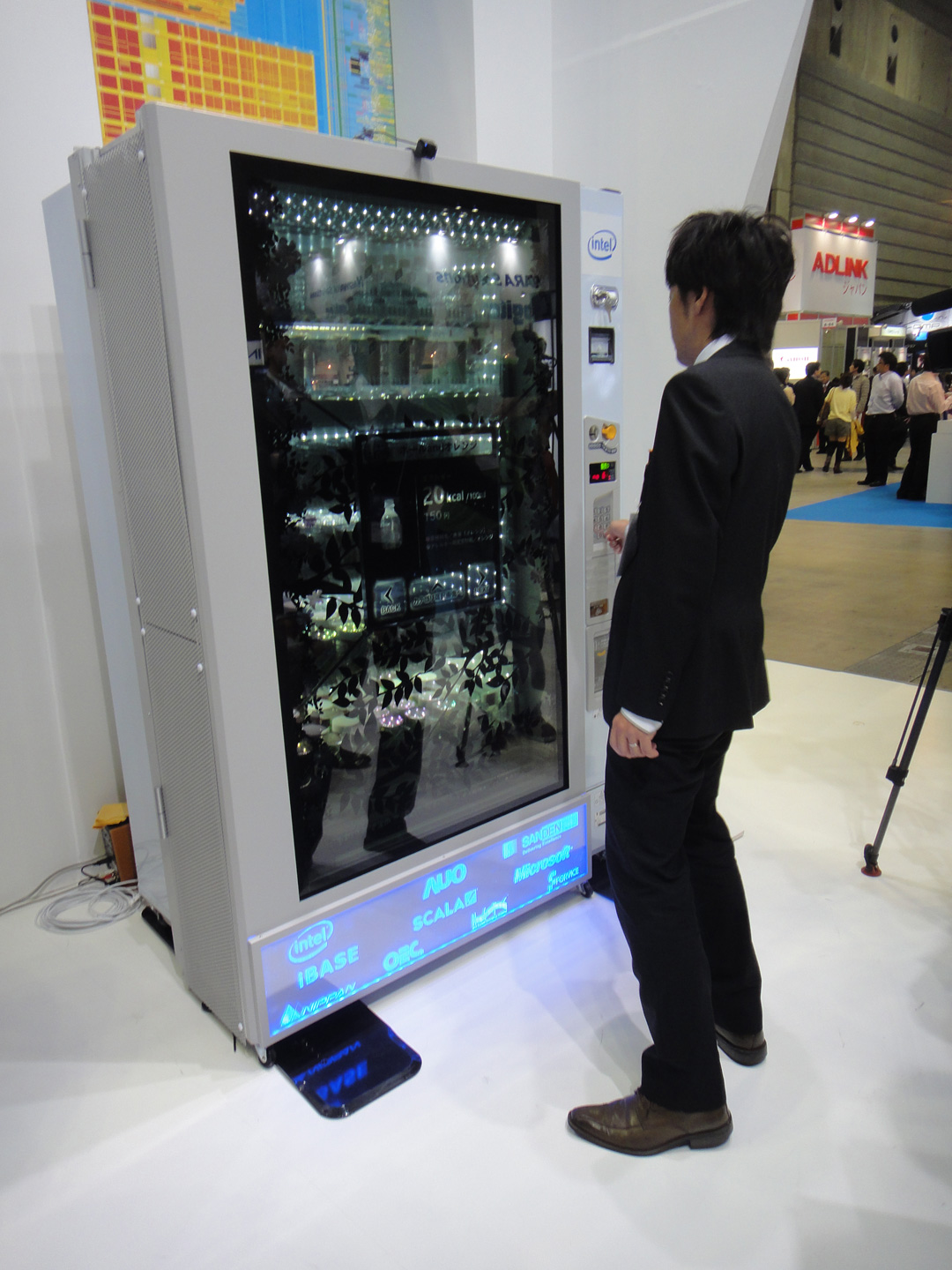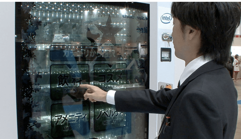 There can be no doubt that Japan is the country of vending machines, and this newest model is perhaps the most advanced yet. Developed by Japan-based tech companies Sanden and Okaya (and Intel), this “vending machine 2.0” features a 65-inch see-through display with full HD resolution as the biggest selling point.