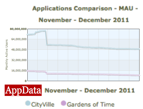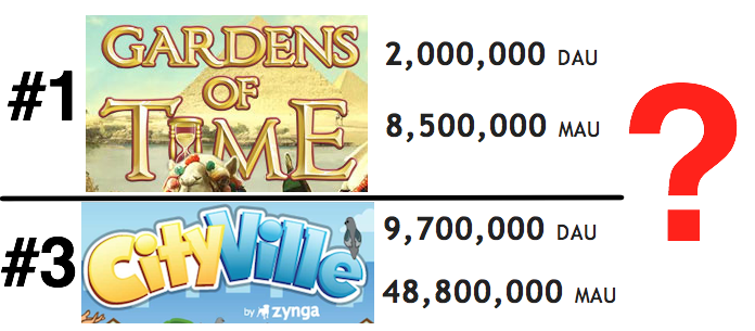 Playdom’s Gardens of Time took the #1 spot of Facebook’s Most Popular Games of 2011 list. But wait, Zynga’s CityVille was ranked #3 despite peaking at over 100 million monthly active users and 21 million daily active users — far more than Gardens of Time’s peaks of 17 million MAU and 4 million DAU, or its current stats according to AppData. That’s because Facebook’s list was mostly based on vaguely described “recommendations”, and hardly on active users.