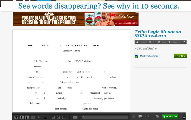 To highlight the chilling effect this legislation could have on free speech on the Internet, today document-sharing site Scribd is protesting SOPA by making every document disappear word-by-word when you visit the site. All in all, there are a billion pages of documents on the Scribd. “With this legislation in place, entire domains like Scribd could simply vanish from the web,” warns Jared Friedman, CTO and co-founder, Scribd.