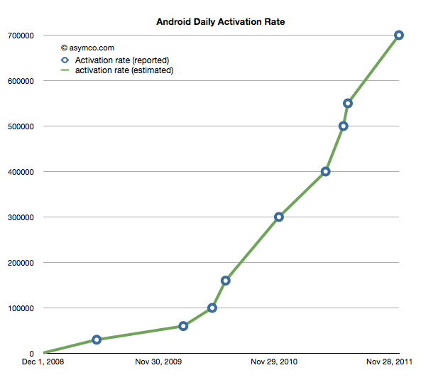 Android just keeps ramping up higher and higher. Andy Rubin tweeted yesterday that there are now more than 700,000 Android phones activated every single day, which is up from 500,000 activations per day last June. You can see how steep the ramp has been over the past three years by looking at the chart up top, which comes from Horace Dediu at Asymco.
