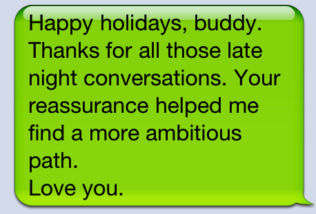 We stand above a bottomless well of gratitude. Say “thank you” to a hundred friends and you still won’t run out. It’s now so quick and inexpensive to communicate across long distances, the only limiting factor is our spirit. Sure, texting 20 friends in a row with the reasons you love them can be a mental work-out. But imagine doing it by phone, by letter, in person?