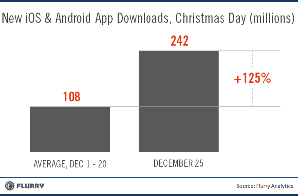 In terms of apps, a record 242 million total apps were downloaded across both platforms, a 125 percent jump from the daily average earlier in December. Last Christmas, the number of combined downloads was 150 million.