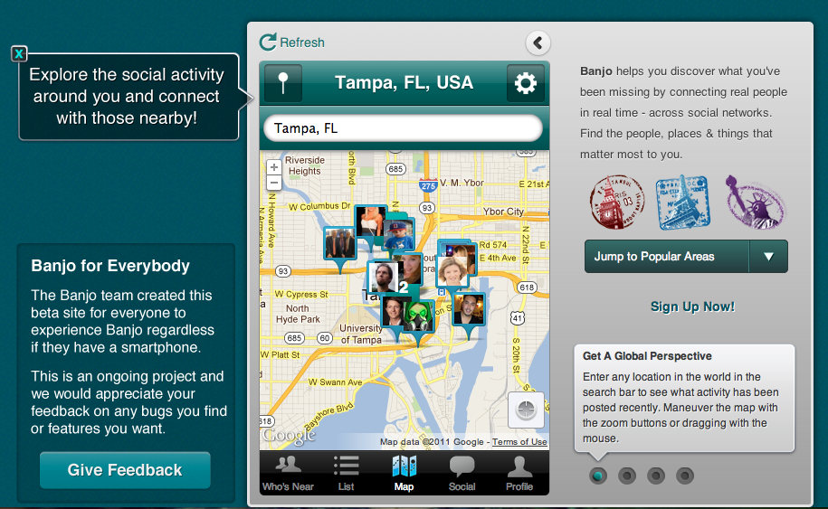 Banjo, the creepy/awesome cyber-stalking app (I mean social discovery service) that shows you who’s nearby based on their Facebook and Foursquare check-ins, geotagged tweets, TwitPic and Instagram uploads, is now a web app, too. In case you haven’t yet download the iOS or Android application to your mobile device (or are some kind of Windows Phone-using rebel), you can check out the service via the recently updated Banjo website instead.