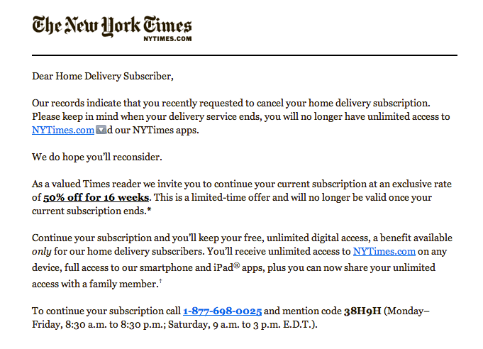 Our records indicate that you recently requested to cancel your home delivery subscription. Please keep in mind when your delivery service ends, you will no longer have unlimited access to NYTimes.com and our NYTimes apps.