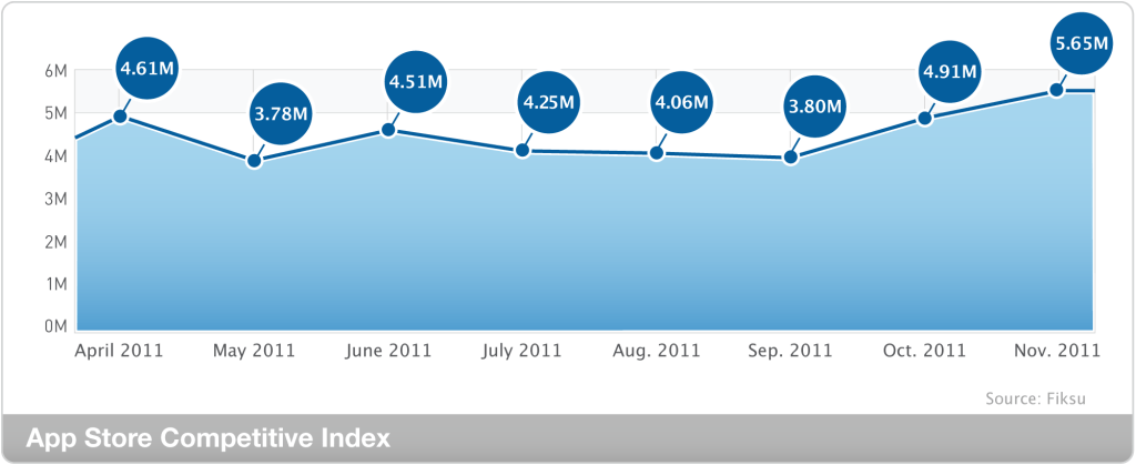 Marketing technology company Fiksu tracked the impact of the iPhone 4S on iPhone app downloads and found that download volume of the top 200 free apps increased 15% from October’s previous record high of 4.91 million daily downloads. In November, the firm’s “App Store Competitive Index,” which measures this trend, peaked at 5.65 million downloads per day – the first time it has topped the 5 million mark. That’s an increase of 83% over November of last year.