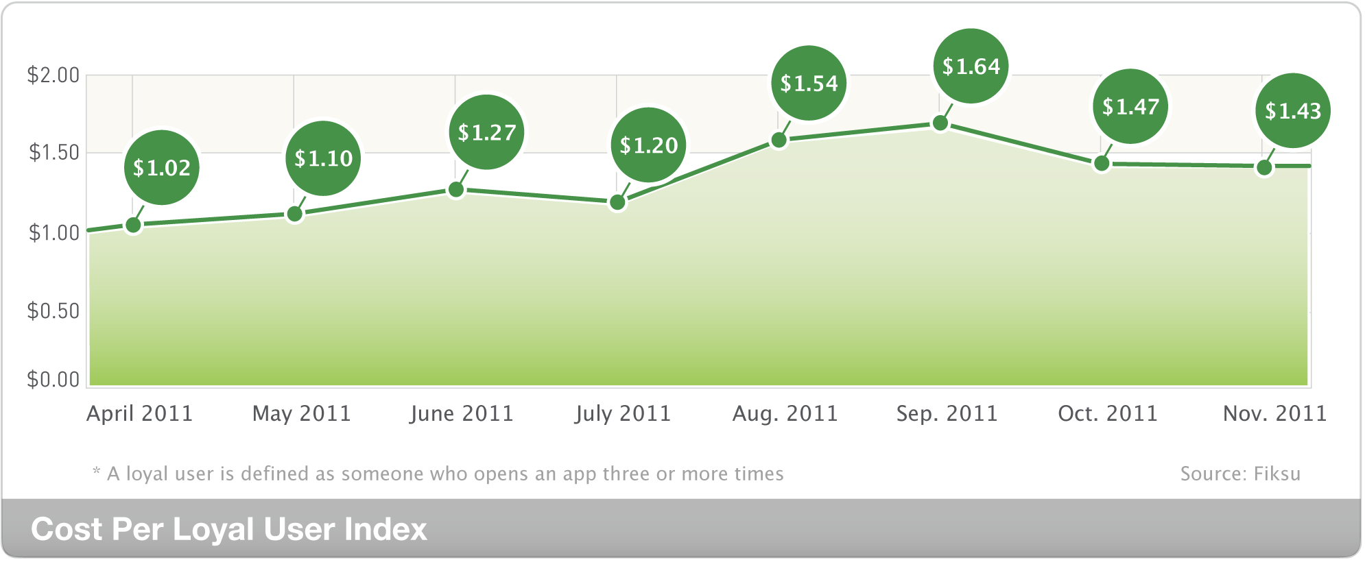Meanwhile, app marketers, which the firm’s second index, the Fiksu Cost per Loyal User Index, addresses, are getting smarter about their ad spends. This index remained steady last month, only down four cents from October’s $1.47 to $1.43 in November. During the month, there was a steady demand for app downloads, unlike in October.