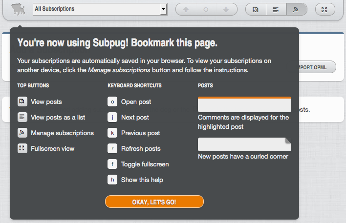 Getting Subpug up and running on your phone and/or tablet is easy as pie. Simply enter your email address into the proper field on the settings page, and you’ll be sent a link. Click the link on your phone, bookmark it, and you’re ready to go. On mobile the experience can be a bit frustrating if you have thousands of subscriptions (it loads a bit slow, and froze on me once), but as I said Subpug is meant for the casual reader.