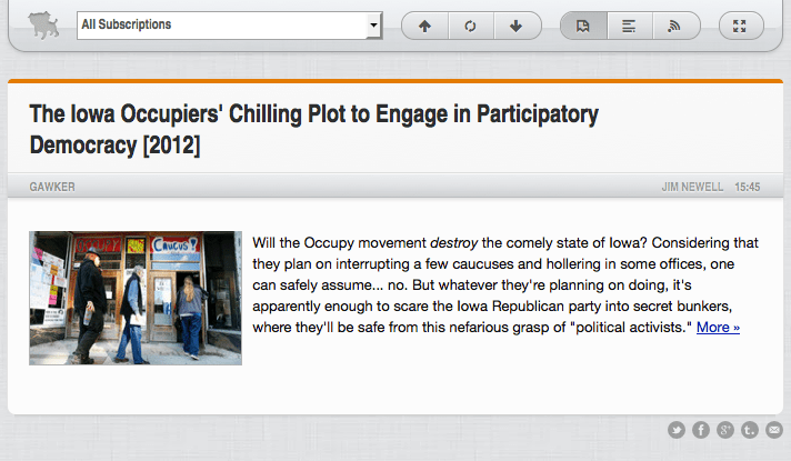 The first thing you’ll notice is that it’s a totally different look from Google Reader, with a grey background and a nice, clean layout. But there’s more: on the left-hand side of the page you’ll see comments from the story that’s highlighted. I find this to be a pretty smart addition to your average RSS reader. I mean, what’s a post without the comments?