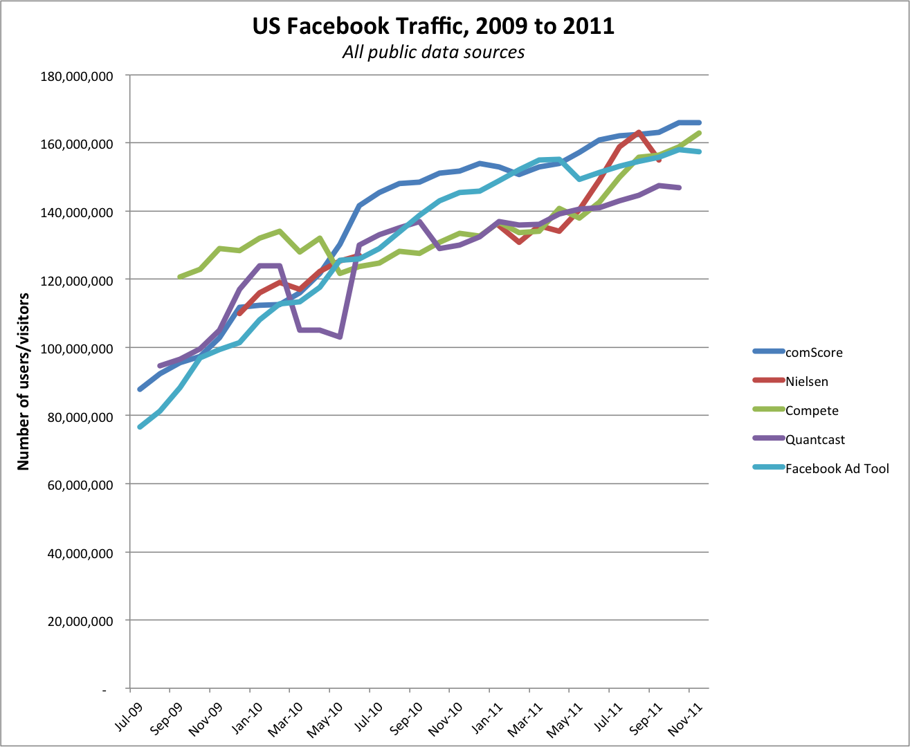 The other measurement firms have been all over the place, although they tell relatively similar stories when you zoom out from the monthly anomolies. Compete and Quantcast have regularly adjusted their methodologies after the fact. They haven’t said so, I’ve just observed that, so I’m left unsure of what to make of their Facebook findings. Meanwhile, Nielsen has irregularly published its numbers, (openly) announced methodology changes, and shown odd trends like a big drop in September (the last time it provided monthly US Facebook data).