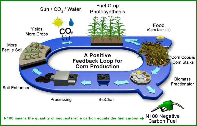 Our proprietary biomass fractionator technology extracts useful hydrocarbons from biomass, leaving behind the excess carbon as a high purity solid. The process generates activated carbon with a very high surface area which will allow it to be used as a soil enhancer similar to “terra preta.” By burying this carbon in an appropriate manner, we can greatly enhance soil fertility while sequestering carbon for hundreds of years. In contrast, normal plant decomposition occurs in just a few years, releasing the plant’s carbon as CO2 and even more harmful methane gas. Our process yields about the same amount of carbon as gasoline so, if we sequester this carbon as a soil enhancer, or simply bury it as coal, the associated fuel has a N100 Negative Carbon Rating.