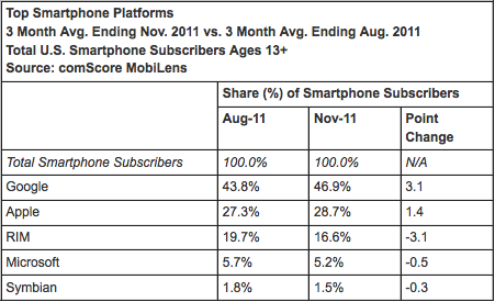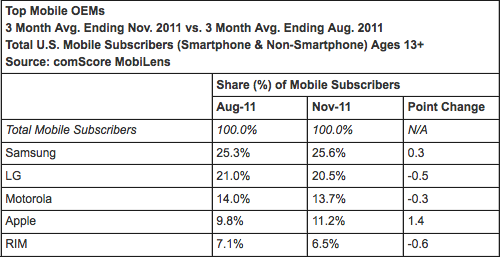 LG (number 2) and Motorola (number 3) both slipped a bit during this time frame, along with last place RIM (which is to be expected, seeing that RIM is doing silly things like getting $1.7 million in PlayBooks stolen at a truck stop).
