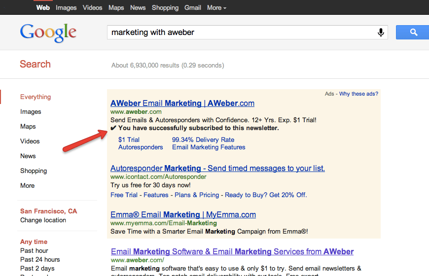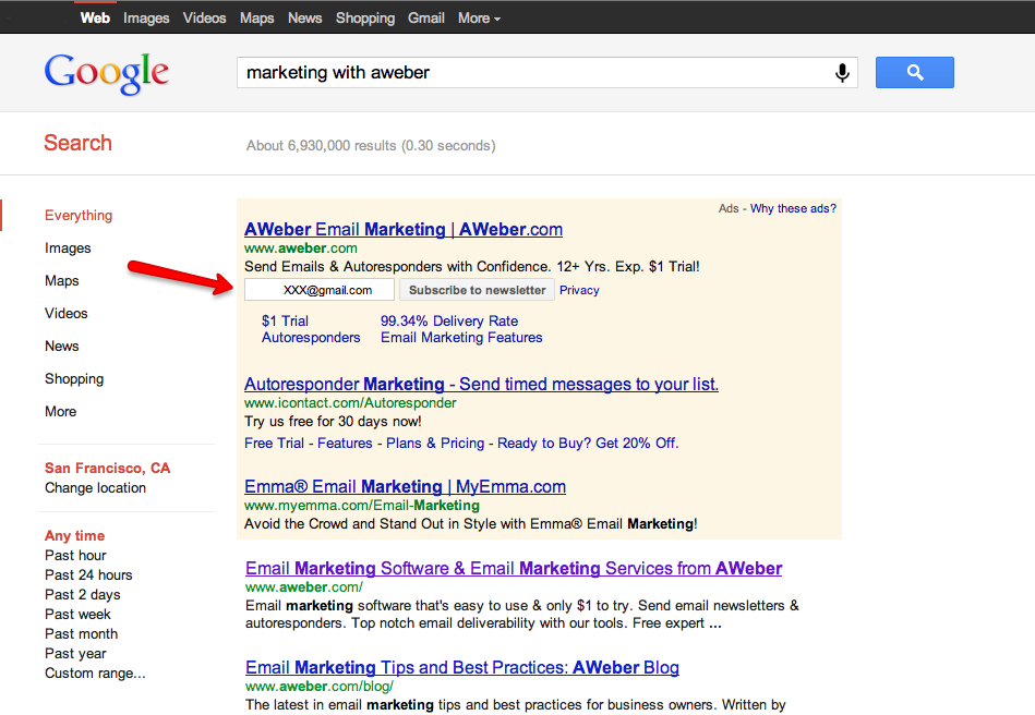 Emailblog pointed out earlier this month that the ads were running with automaker Honda (ads which I still can’t see), and it seems like those offerings have expanded to results for email marketing services AWeber and Constant Contact (ads which I can see). Clicking on the “Privacy” button next to the subscription button lets you know that your email will be sent to the advertiser — In case that wasn’t clear(?).