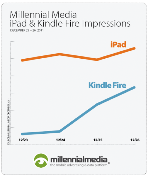 In November, Mobile ad network Millennial Media reported that Amazon’s new tablet devices Kindle Fire, was seeing ad impressions grow at an average daily rate of 19% since its launch to the public in the middle of the month. Millennial says it’s not just seeing millions of impressions and the device is on a monthly run rate of hundreds of millions of impressions. But that data was gathered from a few weeks of usage from consumers in November, and as Amazon reported yesterday, December’s holiday season brought record sales for the Kindle Fire, with over 4 million Kindle devices sold in December. The Kindle Fire was the most gifted and wished for product on Amazon this season.