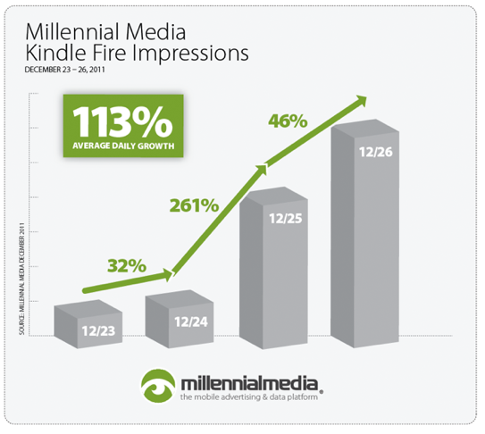 Today, Millennial is releasing data from its ad network showing impressive growth numbers from the Kindle Fire over the holiday weekend. In November, impressions on the Kindle Fire grew an average rate of 19 percent every day. Over this past weekend, Millennial says that as consumers opened and used their new Kindle Fires, ad impressions increased even more. As millions of consumers unwrapped new Kindle Fires, Millennial saw an average daily growth rate of 113 percent.