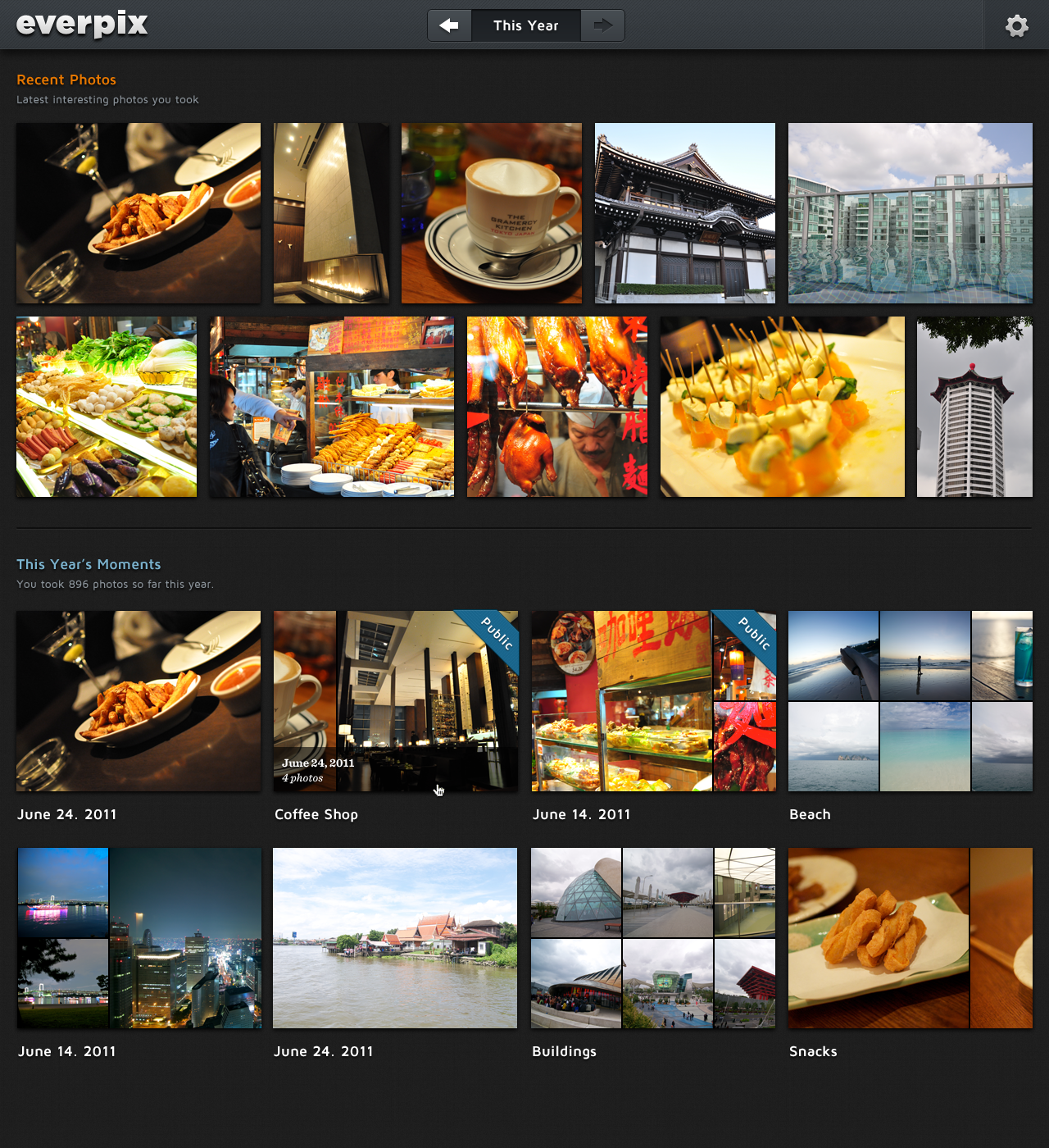 Once connected, Everpix uses a feature called “assistive curating” to create “Moments,” which are similar to iPhoto’s “Events,” but are built for you automatically. You can see an Apple-like design aesthetic here, which is not surprising given that two of Everpix’s Co-founders, Pierre-Olivier Latour and Kevin Quennesson, each spent several years with the company. Meanwhile, the third Co-founder, Wayne Fan, was previously at frog design.