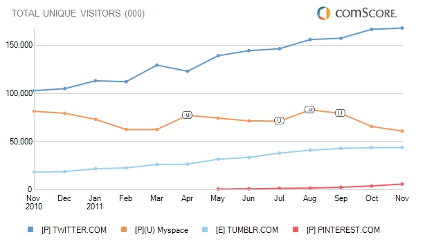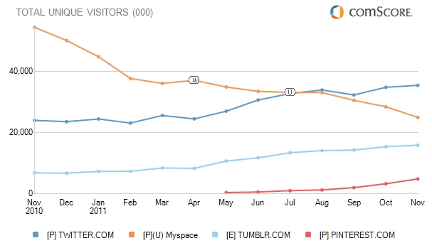 Based on all these numbers, 2011 is looking like a banner year for the next era of public self-expression and sharing. The ugly, hacked-up MySpace user profiles of past years are less popular than ever, and users are busy sharing through their beautiful Tumblr themes, through Twitter’s simple 140-character messaging service, and through their online Pinterest pinboards.