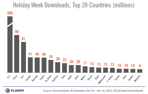 With nearly 7 million new Android phones and iPhones activated on Christmas Day, an app-downloading frenzy was a foregone conclusion. App research firm Flurry estimates that a combined total of 1.2 billion apps were downloaded during the holiday week between December 25-31. That compares to an average of 750,000 mobile apps downloaded per week earlier in December, or a 60 percent jump.