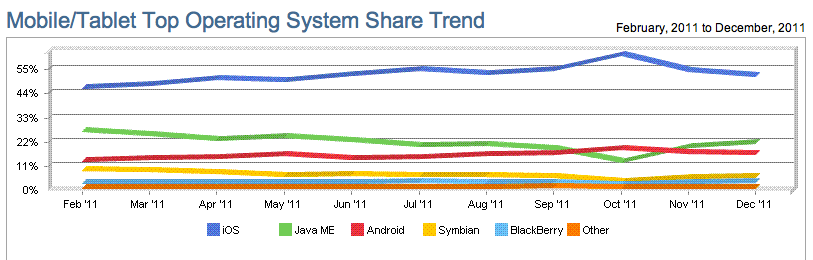 Of course, it may not be fair to compare iOS directly with the other mobile platforms, given that the iPad accounts for a good bit of Apple’s market share in this slice of mobile data. But even when the iPad is excluded, the iPhone still holds its own with a 25.24% showing. The iPad is at 24.53% and the iPod Touch accounts for 2.32%.
