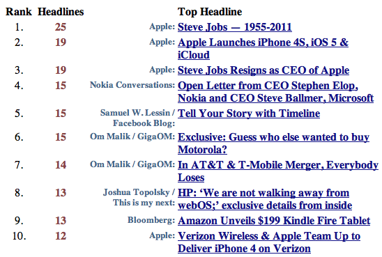 The rest of the list is largely rounded out by news from other tech giants, including Facebook’s launch of Timeline, Twitter’s New New Twitter, Microsoft’s partnership with Nokia, and the failed AT&T/T-Mobile merger.