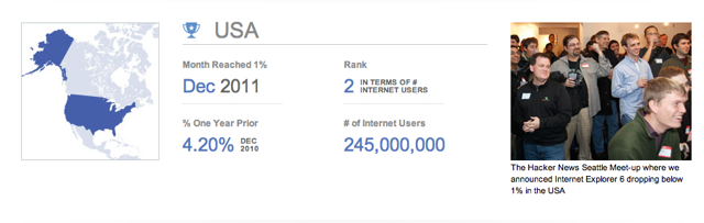 Internet Explorer 6 — long a thorn in the side of many web developers because of its quirks, limited feature support, and cockroach-like resistance to extinction —is finally on its last legs in the United States. And Microsoft is celebrating.