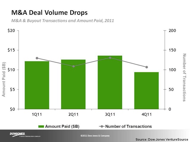 Dow Jones VentureSource says there were 522 exits of venture-backed companies in the US throughout 2011, which represents a significant 4 percent drop in deal activity compared to 2010.