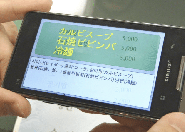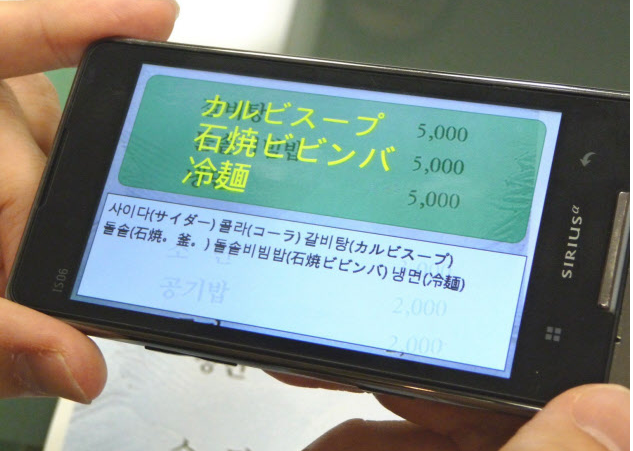 Omron says that in its current form, the app (which isn’t available yet) can handle English, Japanese, Korean, and Chinese. Translations are superimposed over the text shown on the display (in the picture below, you can see three items on a Korean menu shown in yellow Japanese letters).