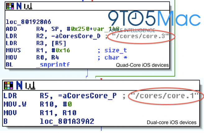 9to5Mac’s sources point to two images — the count begins at 0 for the first processing core, which would mean a dual-core device would be referred to with the label “/cores/core.1.” The existence of a reference to “/cores/core.3.” means that Apple has indeed been slaving away on quad-core iPhones and iPads.