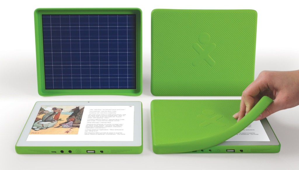 As you may recall, the tablet has an 8″ screen, so with that for scale, it looks to be about three quarters of an inch thick. The bright green material appears to be silicone, and the rest of the construction will be plastic. The project’s founder, Nicholas Negroponte, wanted the device to be “indestructible,” and it certainly doesn’t look dainty, but it also doesn’t appear to be waterproof — though the front part could certainly be water-resistant.