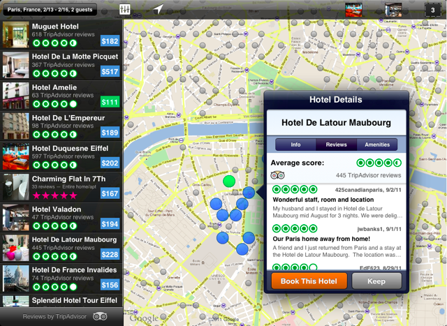 As with the apps’ flight search, the new feature is both straightforward and good-looking. Tap the ‘Hotel’ button from the main screen, and you’ll see a map with your GPS dot at the center (by default it looks for hotels near your current location, though you can easily swap it to another city). Enter the dates you’re planning to book and the app will start searching, with small orbs appearing on the map to represent each hotel. The app will color these orbs when possible to indicate the price — green means cheap, blue, average, and red, pricey. Tapping on an orb will bring up reviews from TripAdvisor and key details about the hotel.