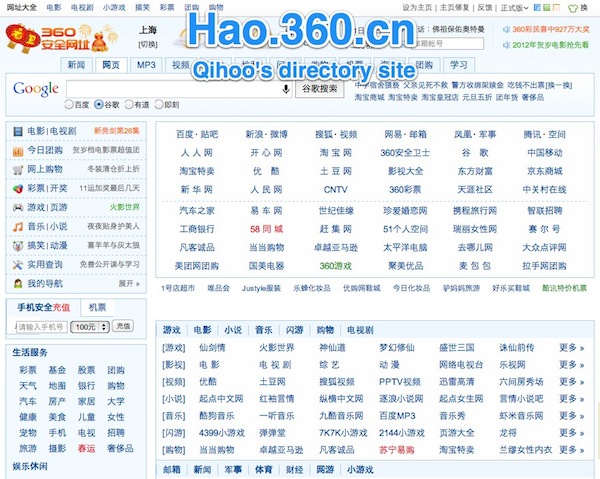 Leveraging that trust and brand recognition, Qihoo then rolled out a suite of security-related products. In China, the Qihoo 360 Safe Browser is second only to Internet Explorer in market share. The browser directs massive traffic to a start page (hao.360.cn) full of paid links to popular Chinese websites, with a layout like Yahoo’s circa 1996. It won’t win any awards for web design, but selling links and search traffic on that one page generated 60% of Qihoo’s $47.5 million in Q3 2011 revenue (see also Red Tech Advisors’ superb deep dive on Qihoo’s innovative business model).