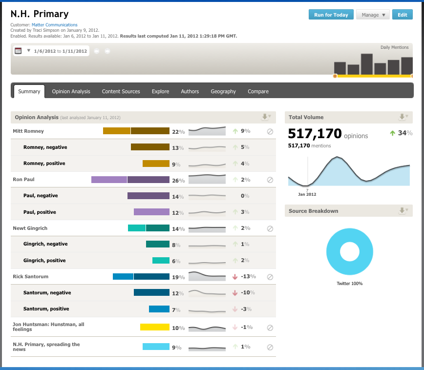 Below you can see the full breakdown of the Twitter discussion of the top two finishing Republican candidates. Though Ron Paul lost last night, his supporters have been active over the last week; his second place finish last night and top spot in positive discussion on Twitter may be, at the least, a moral victory going forward.
